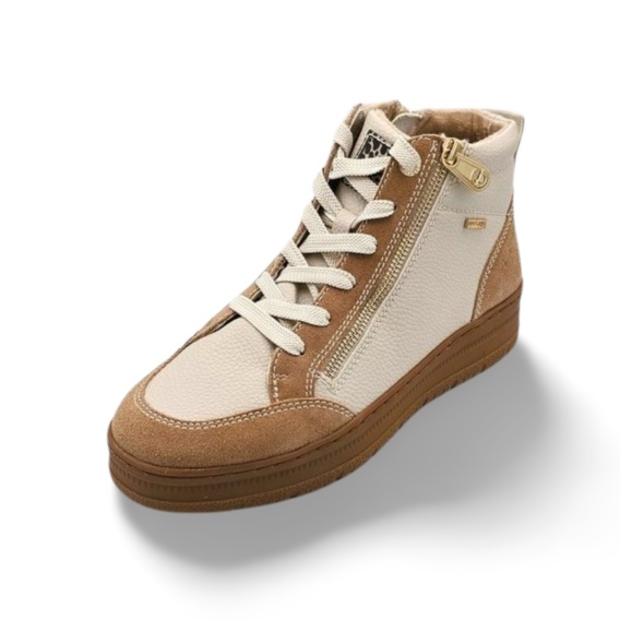 Damskie botki zapinane na suwak i sznurowanie z ozdobnym złotym suwakiem, wyjmowana wkładka, antypoślizgowa i amortyzująca podeszwa oraz wodoodporna membrana DUO‑TEX.