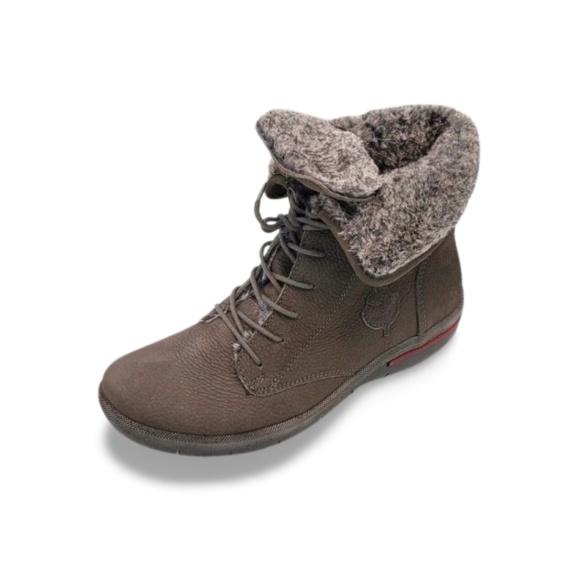 Damskie botki ze skóry nubukowej w tęgości H, z wywijanym kożuszkiem, sznurówką i bocznym suwakiem. Wyjmowana, profilowana wkładka i lekka, amortyzująca podeszwa zapewniają komfort.