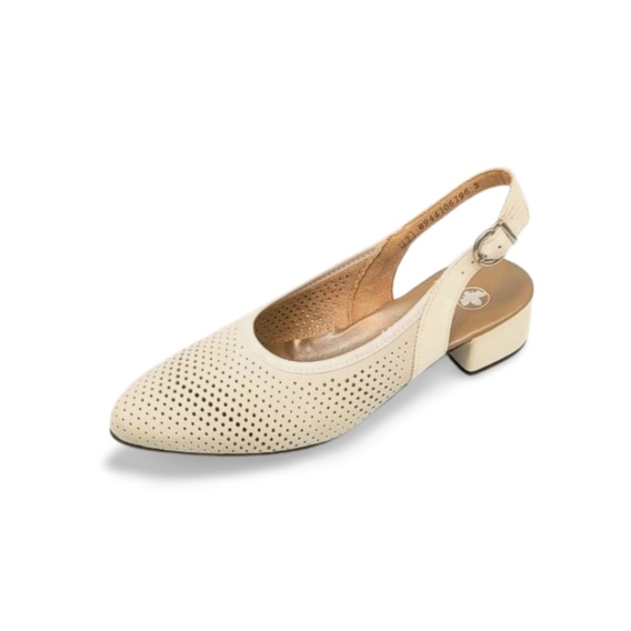 Eleganckie czółenka damskie wykonane z wysokiej jakości skóry licowej i skóry ekologicznej, z zakrytym przodem dla ochrony palców, oraz odkrytą piętą dla lekkości i wentylacji. Model posiada niski obcas, który nadaje sylwetce subtelne podwyższenie, zachowując jednocześnie komfort noszenia. Miękka wkładka oraz technologia Antistress marki Rieker amortyzują każdy krok, zmniejszając zmęczenie stóp i obciążenie stawów — to istotne zalety dla osób, które dużo stoją lub chodzą. Perforacje wierzchniej cholewki poprawiają przepływ powietrza. Model dostępny jest w tęgości G, co odpowiada standardowej szerokości stopy i zapewnia dobre dopasowanie.
