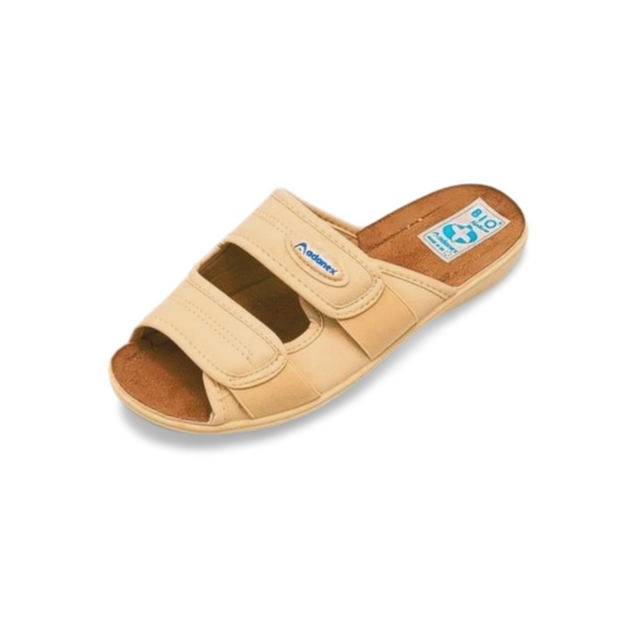 Kapcie damskie BIO w uniwersalnym beżowym kolorze. Model został anatomicznie wyprofilowany, dzięki czemu wspiera naturalne ułożenie stopy i zapewnia wysoki komfort noszenia. Cholewka wykonana ze skóry ekologicznej jest miękka i łatwa w pielęgnacji, natomiast wnętrze oraz wkładka z tkaniny zwiększają wygodę i przewiewność. Kapcie wyposażono w elastyczną podeszwę PU z punktem amortyzacji, która redukuje wstrząsy i poprawia komfort chodzenia. Regulacja na gumki umożliwia dobre dopasowanie do stopy, również tej szerszej. Płaski fason i tęgość H sprawiają, że model doskonale sprawdzi się jako lekkie, wygodne obuwie domowe na co dzień.