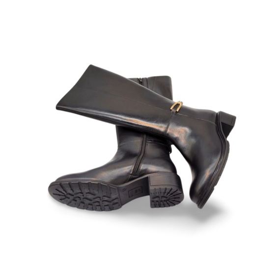 Kozaki damskie wykonane z wysokiej jakości skóry cielęcej w klasycznym, czarnym kolorze. Model wyróżnia subtelna złota ozdoba, która nadaje butom szykownego charakteru. Obcas o wysokości około 3 cm zapewnia lekki efekt uniesienia, jednocześnie gwarantując stabilność i komfort. Kozaki mają tęgość G, czyli standardową szerokość, idealną dla większości stóp. Wnętrze butów wyposażono w wyjmowaną, profilowaną wkładkę, która zapewnia optymalne podparcie stopy, wygodę podczas chodzenia i możliwość stosowania wkładek ortopedycznych. Lekka i elastyczna podeszwa gwarantuje stabilność oraz amortyzację.