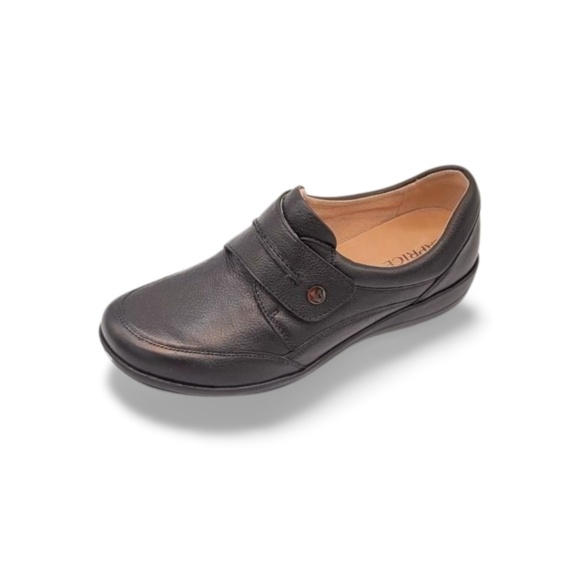 Półbuty damskie w kolorze czarnym. Zapięcie na rzep umożliwia szybkie i łatwe dopasowanie do stopy. Wykonane z wysokiej jakości skóry naturalnej, półbuty są trwałe i eleganckie. Wyjmowana wkładka pozwala na higieniczne użytkowanie oraz włożenie własnej wkładki ortopedycznej. Elastyczna podeszwa o wysokości ok. 2 cm zapewnia lekkość i stabilność podczas chodzenia. Szeroka tęgość H gwarantuje wygodę również osobom o szerszych stopach.
