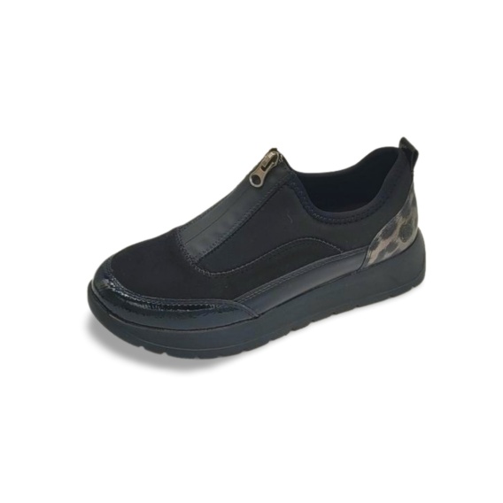 Półbuty damskie w klasycznym czarnym kolorze z subtelnym szarym wzorem panterki na zapiętkach. Cholewka wykonana z połączenia miękkiej skóry ekologicznej oraz materiału tekstylnego, co sprawia, że buty są lekkie, przewiewne i przyjemne w dotyku. Model posiada suwak z przodu, który ułatwia szybkie zakładanie i zdejmowanie obuwia. Wyprofilowana, wyjmowana wkładka zapewnia komfort i możliwość dopasowania do indywidualnych potrzeb. Płaska podwyższona podeszwa (przód ok. 1,5 cm, tył ok. 3 cm) dodaje stabilności i subtelnie podnosi stopę, nie rezygnując z wygody. Dodatkowy akcent w postaci szarego wzoru panterki na zapiętkach nadaje butom wyjątkowego charakteru i nowoczesnego stylu, który świetnie komponuje się z casualowymi i eleganckimi stylizacjami. Model posiada tęgość G, czyli standardową szerokość dla większości stóp, gwarantując komfort noszenia.