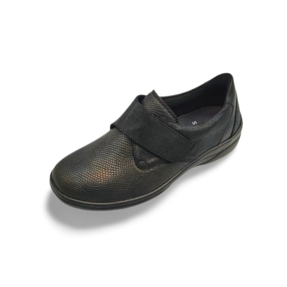Półbuty damskie wykonane z miękkiej skóry naturalnej połączonej z elastyczną skórą streczową, która doskonale dopasowuje się do kształtu stopy – szczególnie w okolicach palców i haluksów. Model zapinany na praktyczny rzep umożliwia szybkie i łatwe zakładanie oraz regulację dopasowania. Tęgość M (bardzo szeroka) zapewnia komfort i swobodę nawet przy problemach ze stopami. Wnętrze buta wyściełane jest przyjemnym w dotyku materiałem, a wyjmowana, miękka wkładka pozwala na zastosowanie indywidualnych wkładek ortopedycznych. Lekka, elastyczna i antypoślizgowa podeszwa gwarantuje stabilność i bezpieczeństwo chodzenia.
