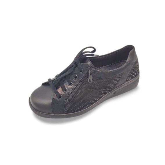 Półbuty damskie wykonane z miękkiej, naturalnej skóry w klasycznym czarnym kolorze. Buty wyposażono w podwójne zapięcie: sznurówki, które pozwalają na precyzyjne dopasowanie, oraz boczny suwak, dzięki któremu zakładanie i zdejmowanie obuwia staje się szybkie i wygodne. Ten model został zaprojektowany z myślą o szerszych stopach, świetnie sprawdzi się u osób z haluksami lub innymi wrażliwymi miejscami na stopie. Tęgość M (szeroka) zapewnia maksymalną przestrzeń wewnątrz buta. Wyjmowana, miękka wkładka skórzana pozwala na zastosowanie własnych wkładek ortopedycznych, a lekka, elastyczna i antypoślizgowa podeszwa dba o stabilność i bezpieczeństwo na każdej nawierzchni.