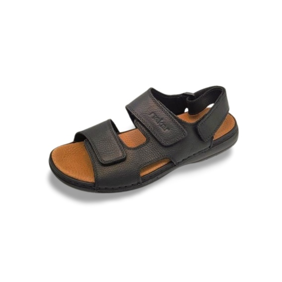 Sandały męskie w klasycznym czarnym kolorze. Cholewka wykonana z wysokiej jakości skóry licowej zapewnia trwałość i łatwość pielęgnacji. Model posiada regulowane paski na rzep, które umożliwiają idealne dopasowanie do stopy i komfortowe użytkowanie – nawet przy szerszej stopie. Wkładka wykonana ze skóry naturalnej wraz z technologią Rieker Antistress amortyzuje każdy krok, zmniejszając nacisk na piętę i stawy, co jest szczególnie korzystne przy długotrwałym użytkowaniu. Elastyczna podeszwa zapewnia stabilność i płynność ruchu, a standardowa tęgość G sprawia, że buty dobrze dopasowują się do większości stóp.