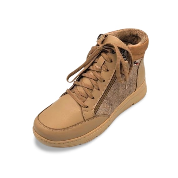 Botki damskie w kolorze beżowym, wykonane z wysokiej jakości skóry naturalnej. Model posiada tęgość H, odpowiednią dla szerszych stóp, oraz komfortową profilowaną, wyjmowaną, materiałową wkładkę, która zapewnia wsparcie, komfort i dodatkowe ocieplenie w chłodniejsze dni. Obuwie wyposażone jest w sznurowanie oraz dwa suwaki boczne, które umożliwiają łatwe zakładanie i idealne dopasowanie do stopy. Ocieplenie w połączeniu z elastyczną, miękką podeszwą zapewnia komfort i stabilność podczas chodzenia.