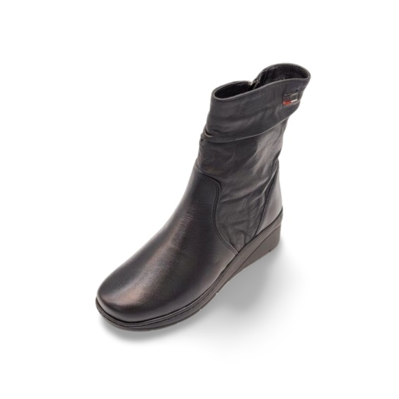 Botki damskie w kolorze czarnym z cholewką 3/4 lekko marszczoną, wykonane z wysokiej jakości skóry licowej naturalnej. Model posiada tęgość H, odpowiednią dla szerszych stóp, oraz komfortową profilowaną, wyjmowaną wkładkę. Botki wyposażone są w suwak, który ułatwia zakładanie i dopasowanie do stopy. Podeszwa na koturnie zapewnia subtelne podwyższenie sylwetki, komfort i stabilność podczas chodzenia.