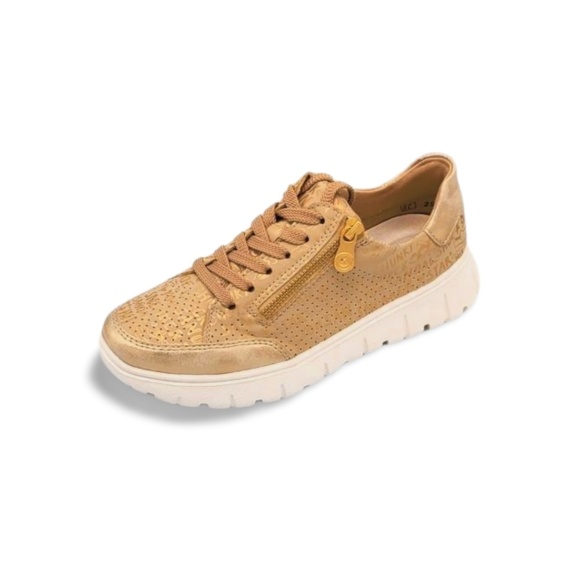 Damskie półbuty sportowe w beżowo-złotej kolorystyce, nadaja im elegancki i uniwersalny charakter, idealny do wielu casualowych stylizacji. Cholewka wykonana z wysokiej jakości skóry ekologicznej perforowanej jest lekka, przewiewna i łatwa w utrzymaniu, co zwiększa komfort noszenia nawet w cieplejsze dni. Podwójne zapięcie – praktyczny suwak oraz sznurówki – pozwala szybko zakładać buty i jednocześnie precyzyjnie dopasować je do stopy. Wkładka wyjmowana umożliwia łatwe czyszczenie lub zastosowanie własnych wkładek ortopedycznych. Tęgość G sprawia, że półbuty są komfortowe dla standardowej szerokości stopy. Technologia Rieker Anti-Stress gwarantuje lekkość, elastyczność i amortyzację każdego kroku, dzięki czemu półbuty doskonale sprawdzają się podczas codziennego noszenia.